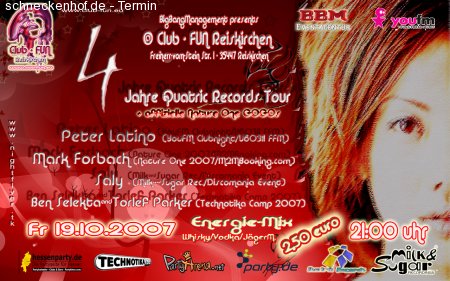 Specials für eingetragene Besucher: "4 Jahre Quatric Records" Tour @ Club-Fun in Reiskirchen (Freiherr-vomStein-Str.1) mit Peter Latino (YouFM Clubnight/U60311 FFM), Mark Forbach (Nature One 2007), Saly (Milk & Sugar Rec.), Ben Selekta & Torlef Parker (Technotika Camp 2007/BBM) - Gewinnt Freikarten auf www.hessenparty.de und holt euch Infos auf www.myspace.com/soundstormagentur